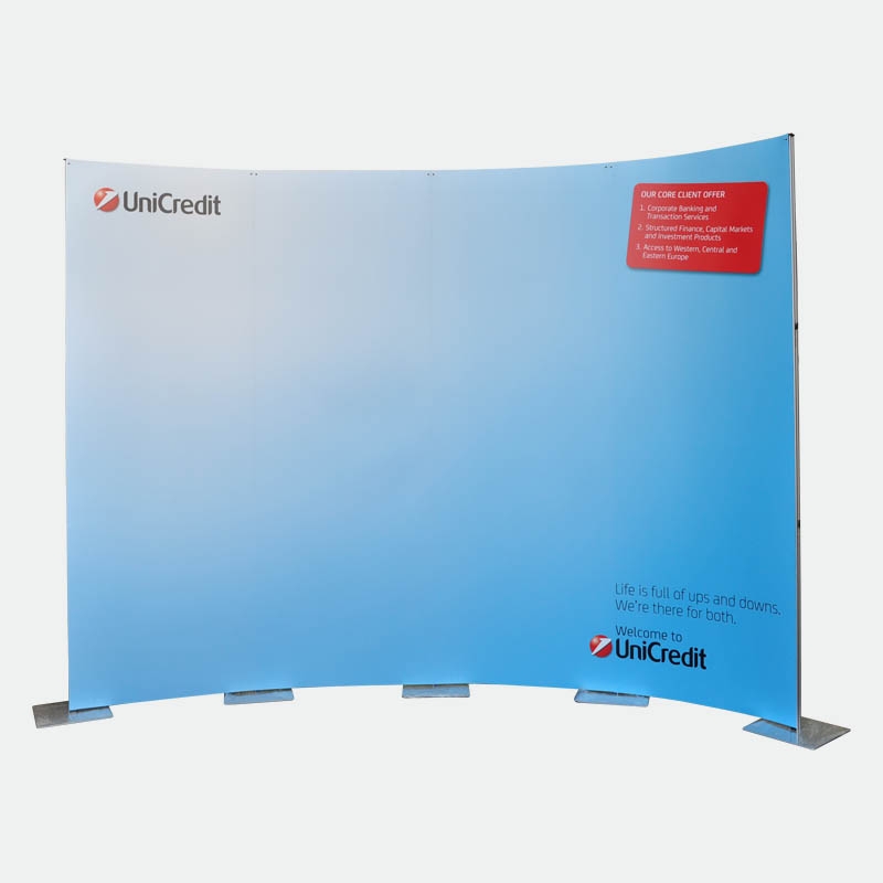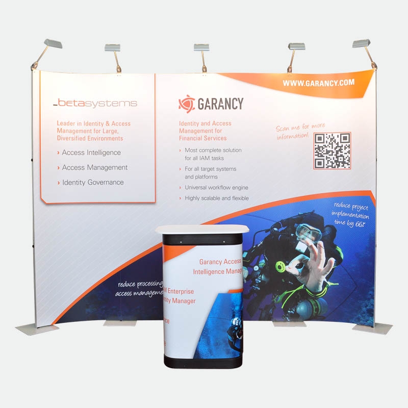 Dank der hochwertigen Magnet-auf-Magnetverbindung der Digitaldruckbahnen erzeugen Sie mit diesem Messedisplay ein durchgehendes Bild, welches nicht durch störende Profile oder Zargen eingeschränkt wird.
