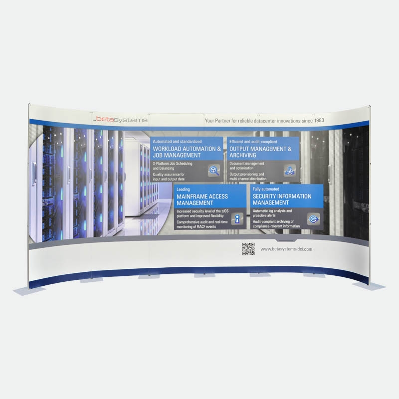 Mit dem Kit 2 sind Sie als Aussteller bestens gerüstet. Beinahe 5 lfdm. Grafikfläche geben Ihnen die Möglichkeit das Messedisplay flex.Connect flexibel einzusetzen. Alle Formen ob gerade, gebogen, in Welle oder komplett organisch können mit den selben Grafikbahnen realisiert werden.