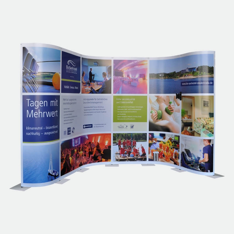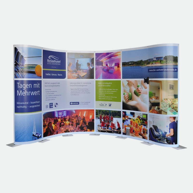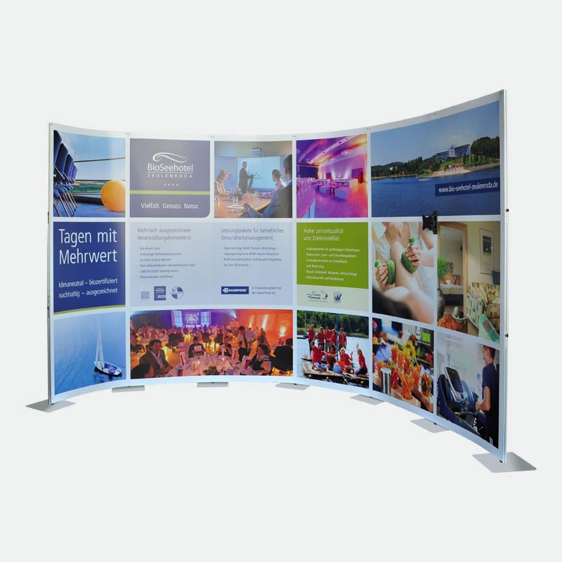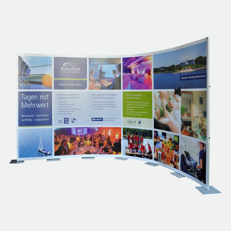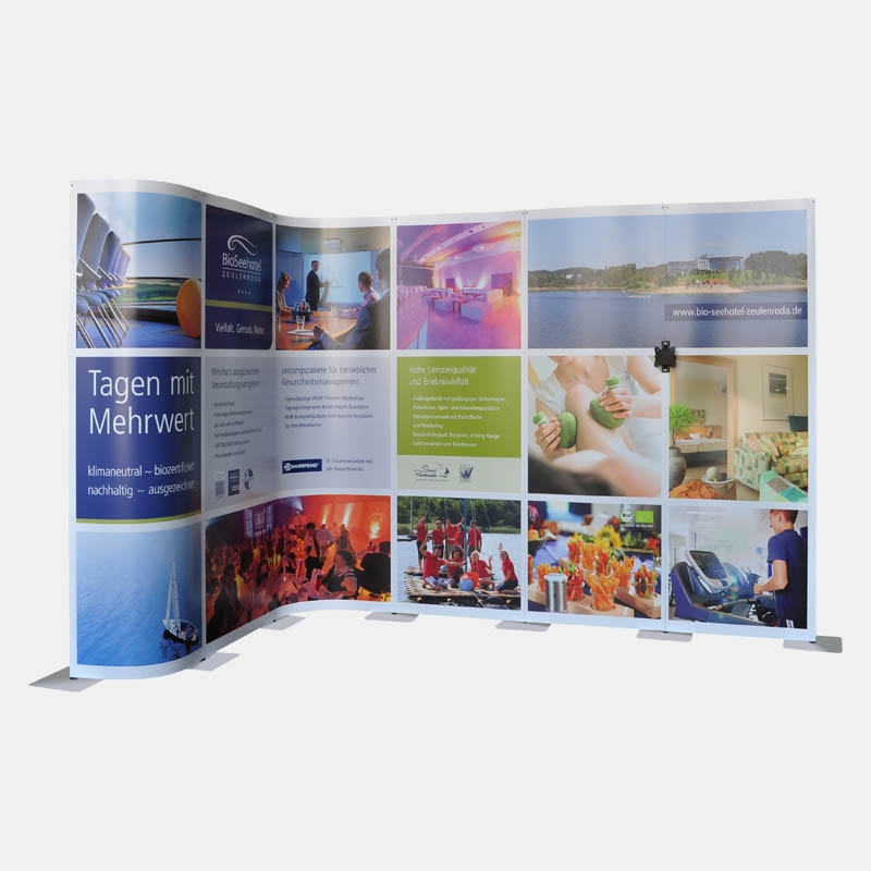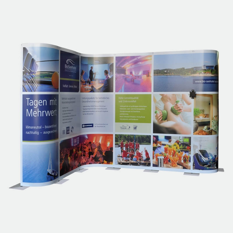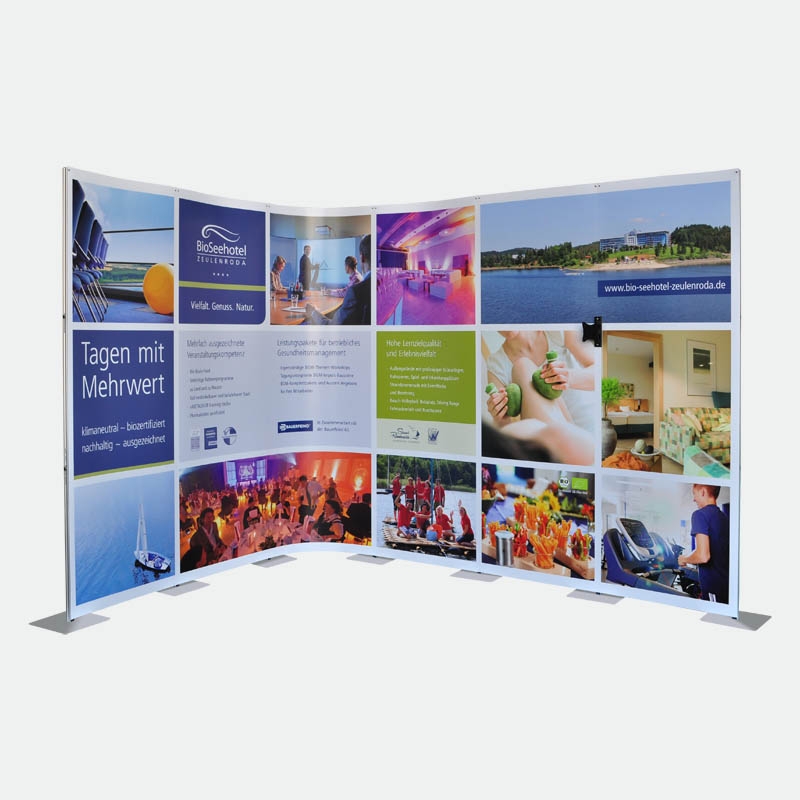 Durch das einfache Prinzip von flex.Connect mit wenigen Bauteilen viele verschiedenen Standformen zu realisieren sind Sie in der Lage Ihren Messestand bestmöglich zu bespielen. Einfach die Pole aufbauen und mit dem Tellerfuß verbinden, in die gewünschte Konfiguration stellen und die Digitaldruckbahnen anbringen. Aufgrund der hochwertigen Magnet- auf-Magnetverbindung der Digitaldruckbahnen können Sie mit diesem Messedisplay ein durchgehendes Bild erzeugen, welches nicht durch störende Profile oder Zargen eingeschränkt wird.