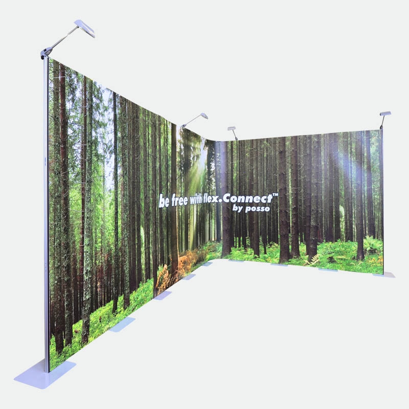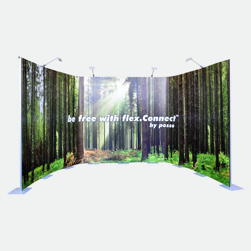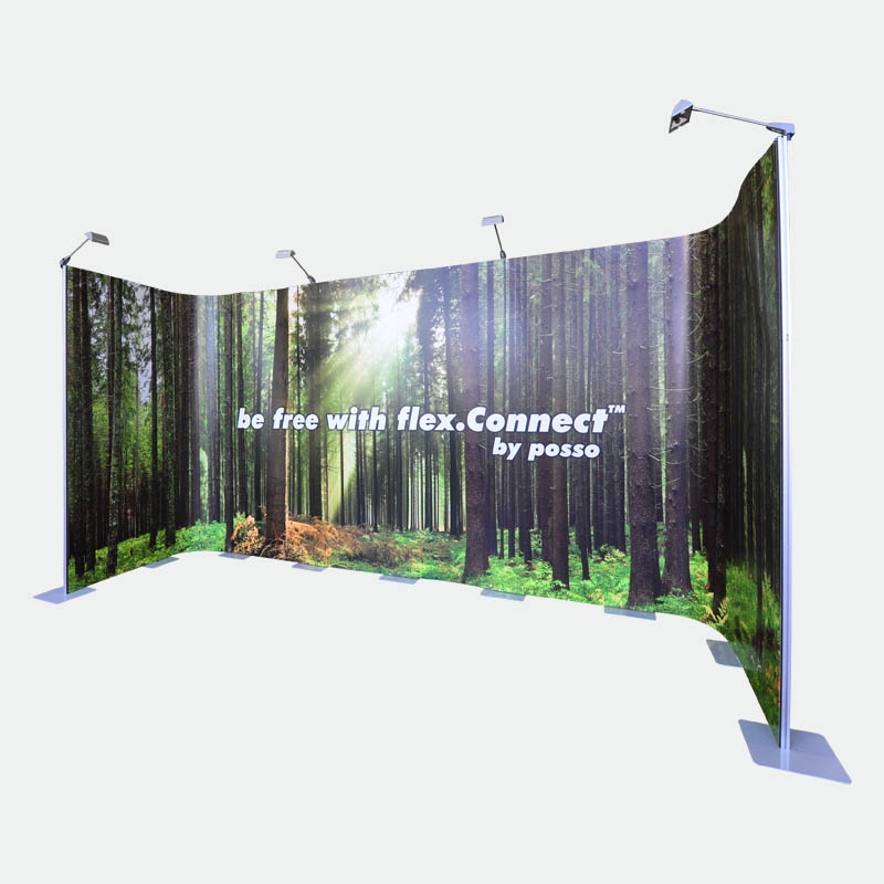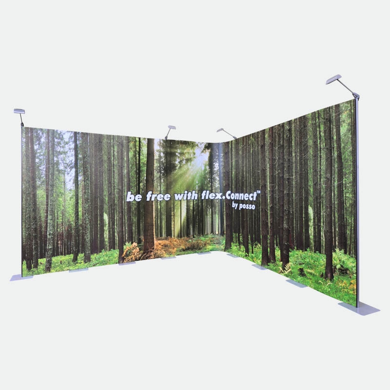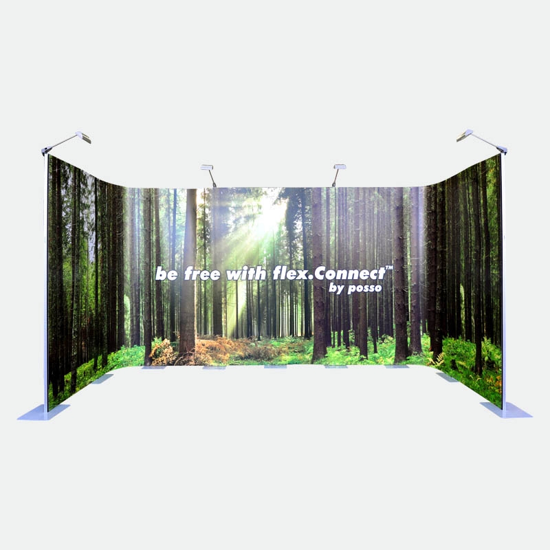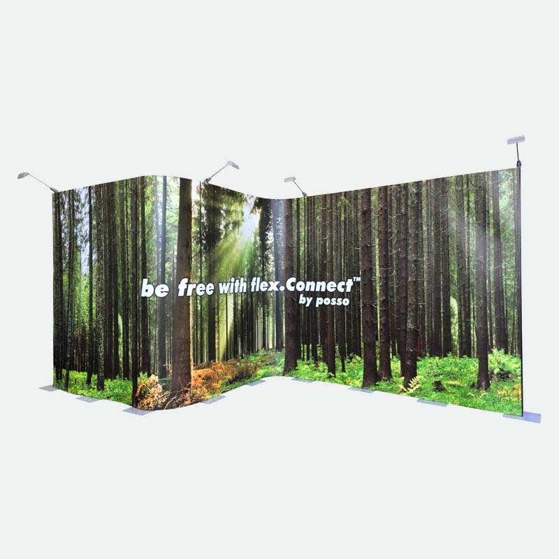 Das Kit 3 mit 8 Bahnen flex.Connect gibt Ihnen die Möglichkeit bis zu 640cm in der Breite zu bauen oder frei eine individuelle Form zu gestalten. Beispielsweise können U-, L- oder S-Formen gestellt werden. Teilen Sie Ihren Stand in Rückwand und zwei Säulen oder bauen Sie dreidimensional mit einem vorstehenden oder zurückversetzten Vorsprung. Nutzen Sie die Freiheiten des flex.Connect Messedisplays!