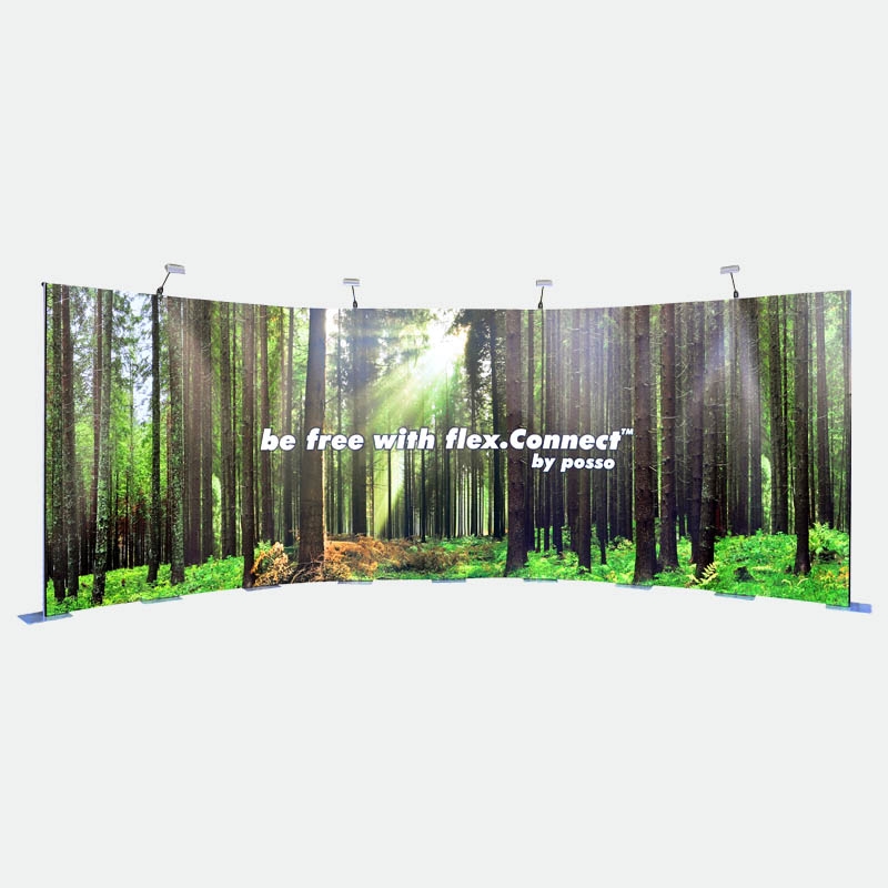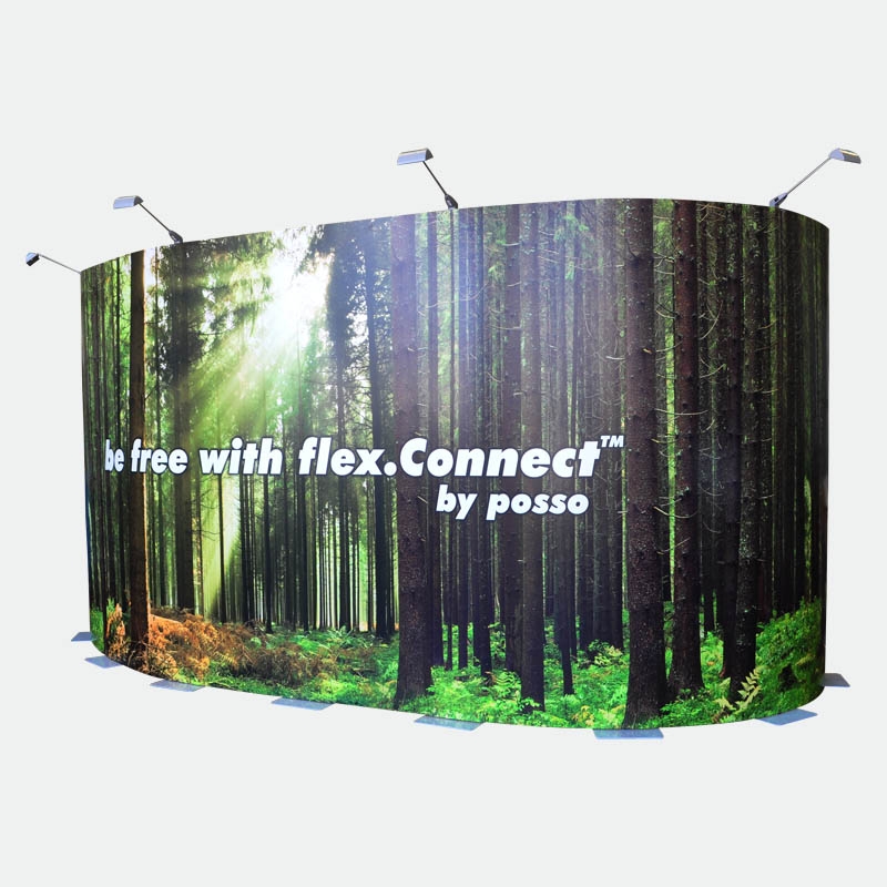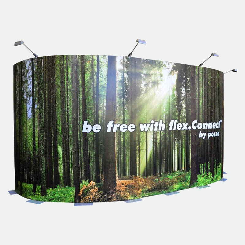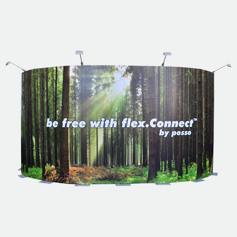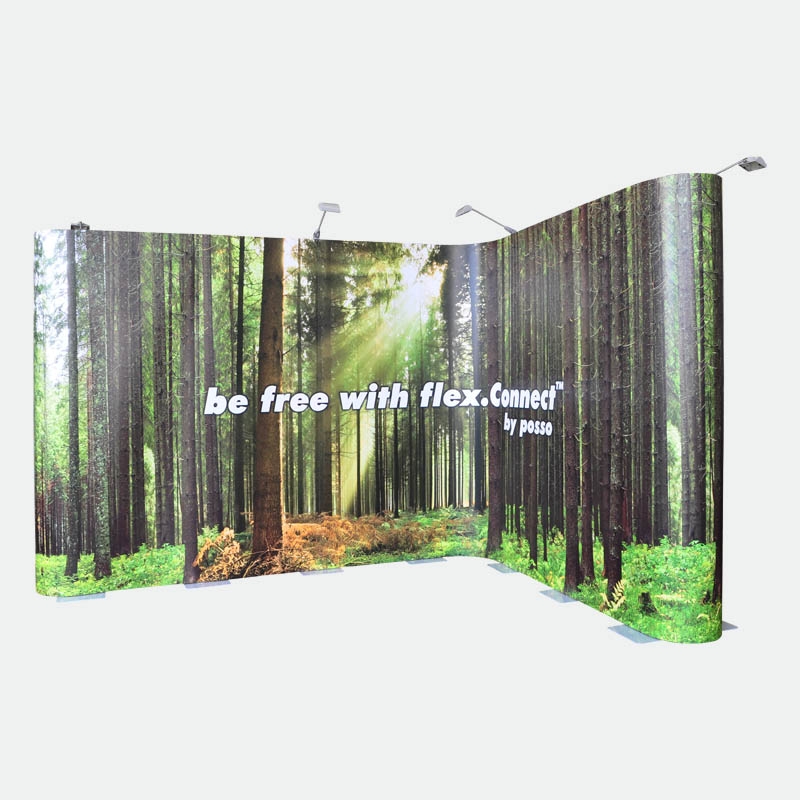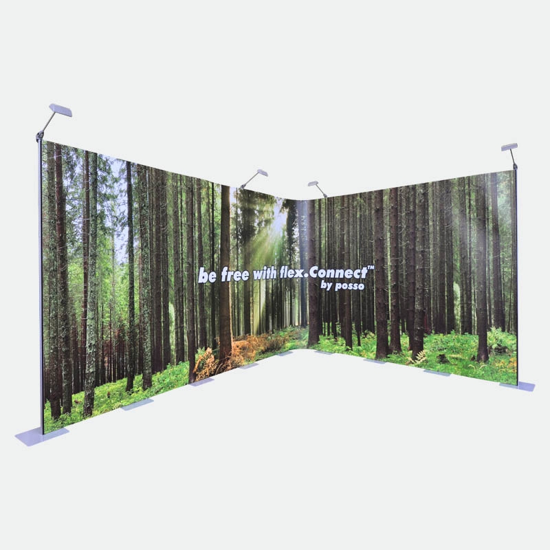 Das Kit 3 mit 8 Bahnen flex.Connect gibt Ihnen die Möglichkeit bis zu 640cm in der Breite zu bauen oder frei eine individuelle Form zu gestalten. Beispielsweise können U-, L- oder S-Formen gestellt werden. Teilen Sie Ihren Stand in Rückwand und zwei Säulen oder bauen Sie dreidimensional mit einem vorstehenden oder zurückversetzten Vorsprung. Nutzen Sie die Freiheiten des flex.Connect Messedisplays!