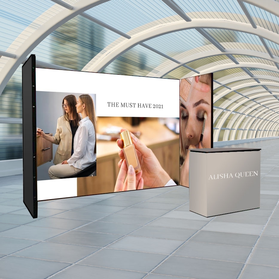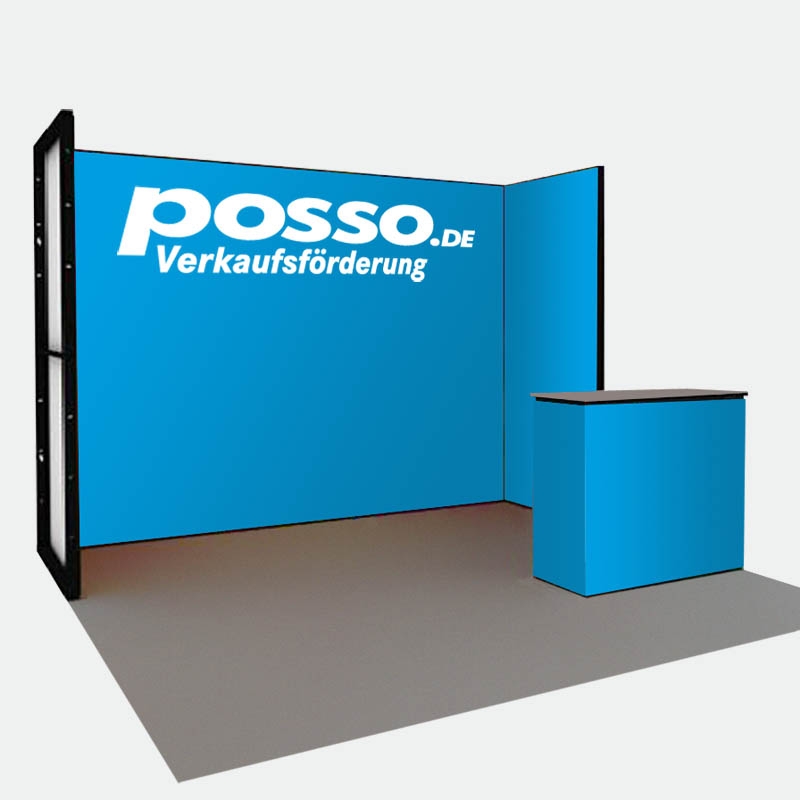 Durch den hochauflösenden Textildruck erhält der Messestand Ihre individuelle Aussage.Verkleinern, erweitern oder überbauen.....