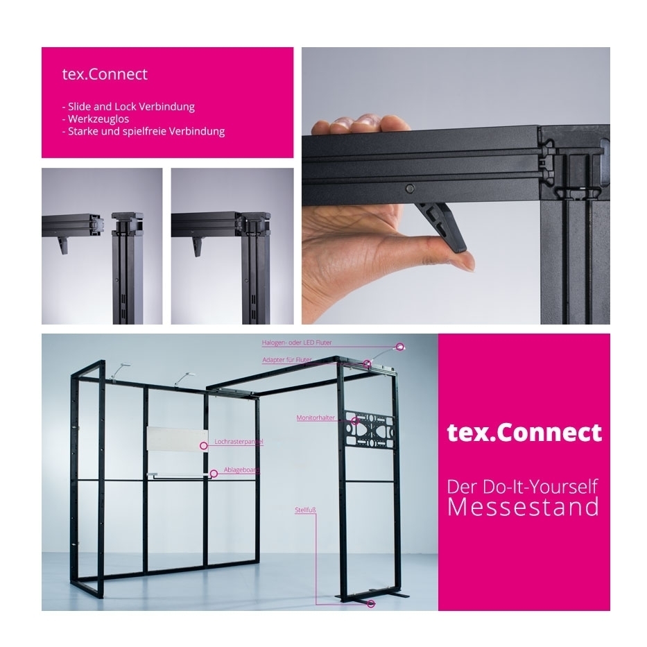 Unsere tex.Connect Kits bilden die Basis für Ihren Messestand. Durch das werkzeuglose Stangen-Zargen-Prinzip können Sie Ihr Equipment problemlos erweitern oder verkleiner. Der modulare Aufbau ermöglicht Ihnen als Anwender, sich Ihrem Messeplatz perfekt anzupassen.