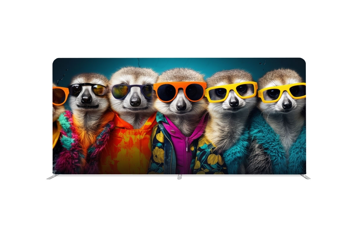 Der brillante thermosublimations Textildruck auf B1-zertifiziertem Stretch-Stoff sorgt für eine glatte, edle Oberfläche – wahlweise einseitig oder beidseitig bedruckt. Dank des praktischen Reißverschlusses wird der Stoff passgenau über das Gestell gespannt und bleibt faltenfrei in Form.